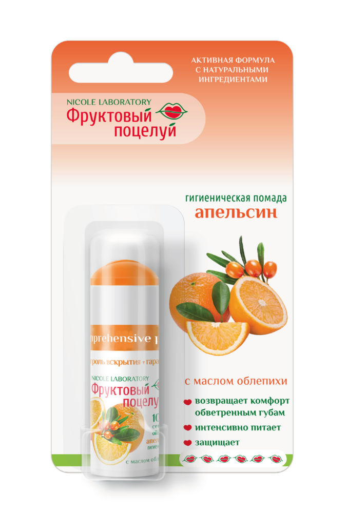 ФРУКТОВЫЙ ПОЦЕЛУЙ ПОМАДА ГИГИЕНИЧЕСКАЯ АПЕЛЬСИН - гигиенические помады Фруктовый поцелуй дарят губам ежедневный бережный уход и надежную защиту от неблагоприятных погодных условий, делают кожу гладкой и нежной. Внешний вид и свойства: гладкая, однородная, бесцветная жировосковая масса с ароматом Апельсина Возраст: с 3-х лет Состав помад обогащен натуральными маслами, которые обеспечивают дополнительное питание и увлажнение, оказывают смягчающее и успокаивающее действие, предупреждают сухость и шелушение, обеспечивают комфорт губам на протяжении всего дня. Не скатывается в уголки губ, можно использовать как основу для макияжа. Широкий ассортимент линейки позволит каждому выбрать свой любимый аромат. АКТИВНЫЕ ИНГРЕДИЕНТЫ: • Масло облепихи - мощный природный антиоксидант, активизирует процессы регенерации в клетках, способствует быстрому заживлению повреждений кожи губ. • Пчелиный воск защищает губы от негативного воздействия окружающей среды, препятствует избыточной потере влаги. • Масло Ши глубоко питает кожу губ, защищает ее от климатических воздействий и УФ-излучения. • Масло Авокадо интенсивно увлажняет кожу, устраняет ощущение сухости и стянутости. Специальные особенности: без красителей Результат: Кожа губ дополнительно напитана, увлажнена. Гладкая, нежная, бархатистая, ухоженная. Комфорт губам на протяжении всего дня.